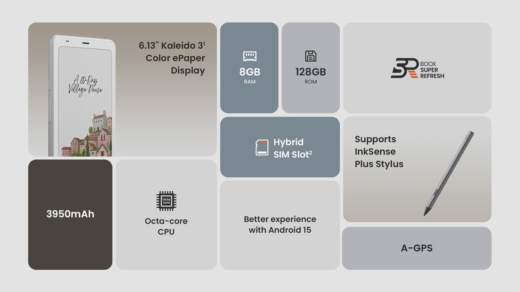 A Palma 2 Pro egy 6,13 hüvelykes Kaleido 3 E Ink kijelzőt használ, ami lágy, újságpapírszerű színeket ad vissza, gyengéd és magával ragadó vizuális élményt nyújtva még közvetlen napfényben is. Mentes a hagyományos képernyők durva tükröződésétől és túlzott stimulációjától, ami arra csábít, hogy lelassulj, és minden szót és képet tisztán és nyugodtan fogadj be.