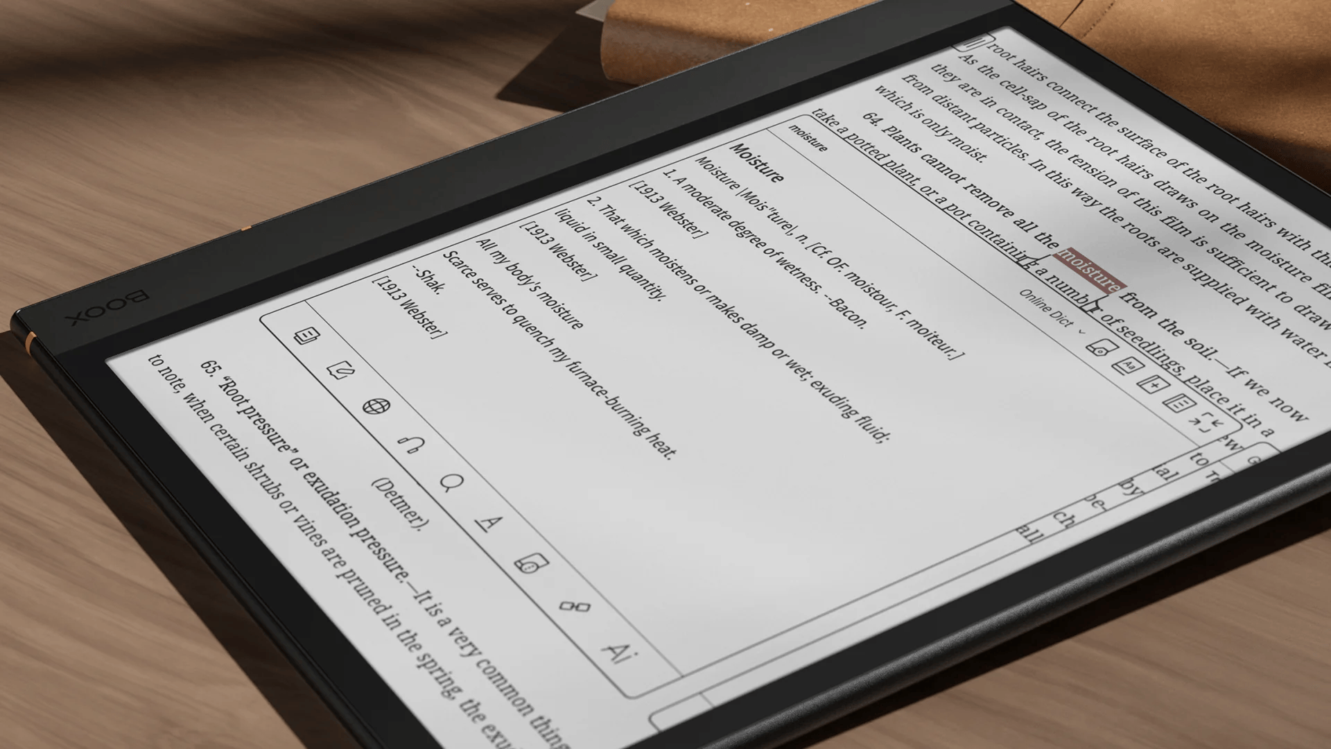 Amikor egy új fogalommal vagy szakzsargonnal találkozol, ne ugorj át rajta – állj meg egy pillanatra, és nézd meg, hogy mit jelent! Jelentésük tisztázása kulcsfontosságú az anyag alapos megértéséhez. A BOOX ePaper tabletek lehetővé teszik, hogy ezt zökkenőmentesen, az olvasási folyamat megszakítása nélkül tedd meg. Egyszerűen nyomj hosszan egy szóra a szótár megnyitásához, vagy keress rá online a definícióra! Az AI-asszisztenst is segítségül hívhatod a mondatok vagy bekezdések értelmezéséhez, bármilyen kérdésed megválaszolásához és gyors, kontextusalapú magyarázat készítéséhez.